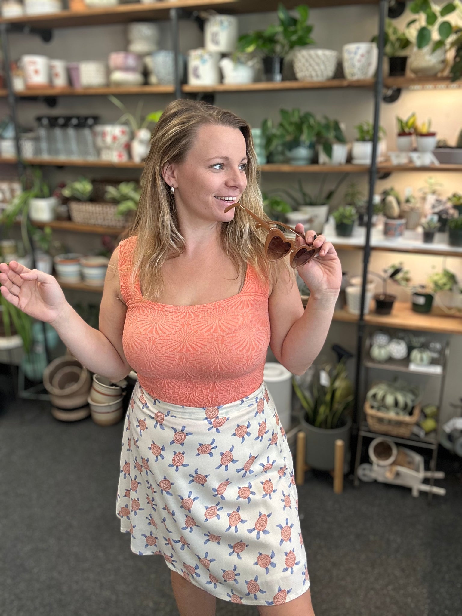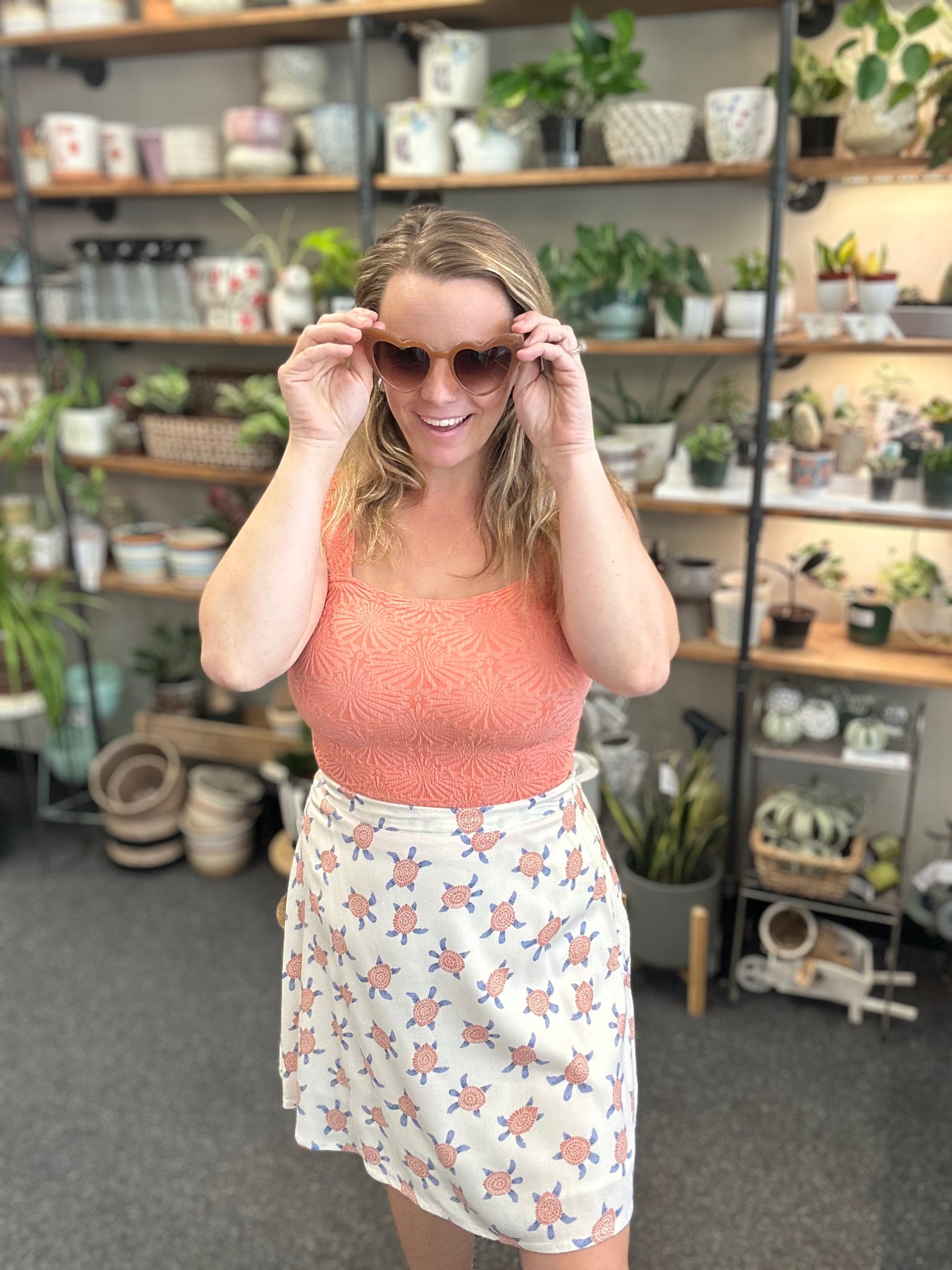 Slip into our Save The Turtles Lined Skirt and show off your playful side! Made with a light weight linen feel and a fun pattern of turtles in a coral and blue design, this skirt is not only stylish but also environmentally friendly, made with 100% Lenzing Ecovero Viscose. Plus, with a convenient side zipper, you'll be ready for any adventure in no time!