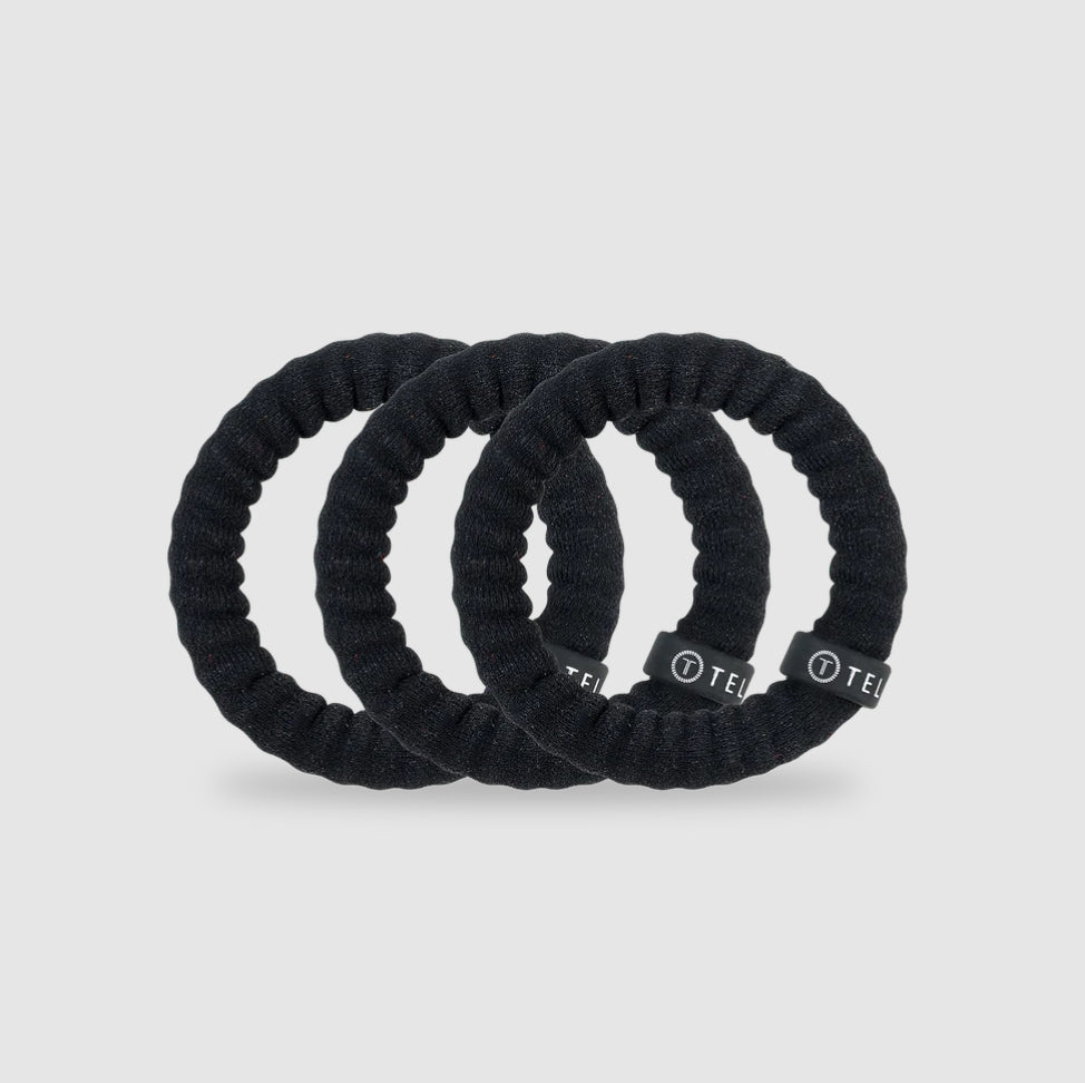 Jet Black Small Nylon Hair Ties are the same game-changing TELETIES coil hair ties. now wrapped in soft nylon for added comfort and curl confidence. These fabric hair ties work great with all hair types but were made specifically with curly and textured hair in mind.