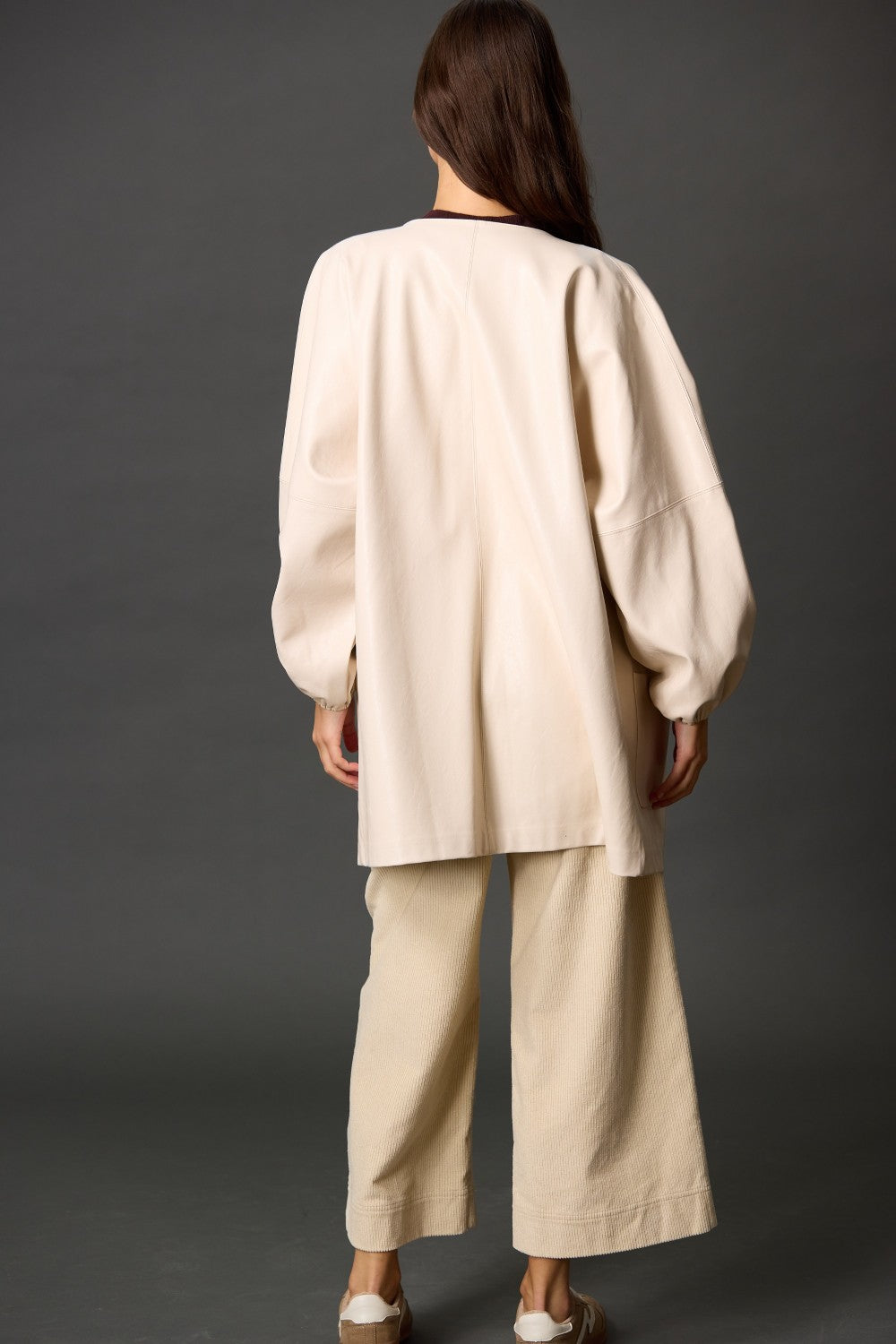 Crafted from sleek, high-quality faux leather, this jacket features voluminous sleeves with gathered cuffs, a relaxed silhouette, and subtle seam detailing for a modern finish.