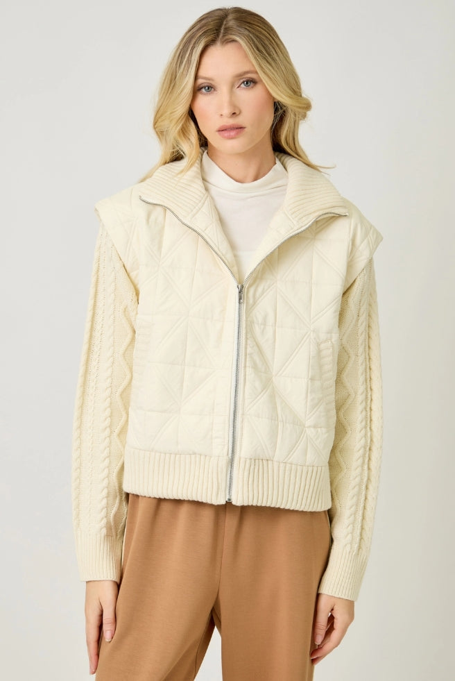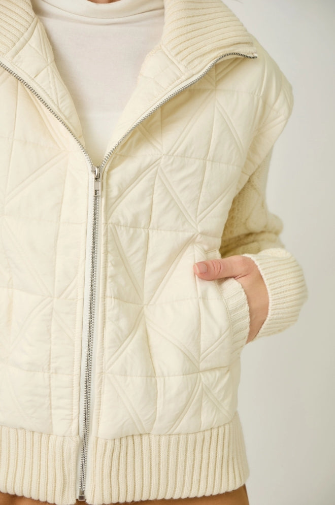 This mixed media jacket combines a quilted front and back with cable knit long sleeves for a unique, textured style. Featuring side pockets and a zipper front closure, it offers both functionality and ease of wear. The jacket's longer back design with a subtle cut-out adds a modern silhouette, making it a sophisticated layering piece for varied weather conditions.