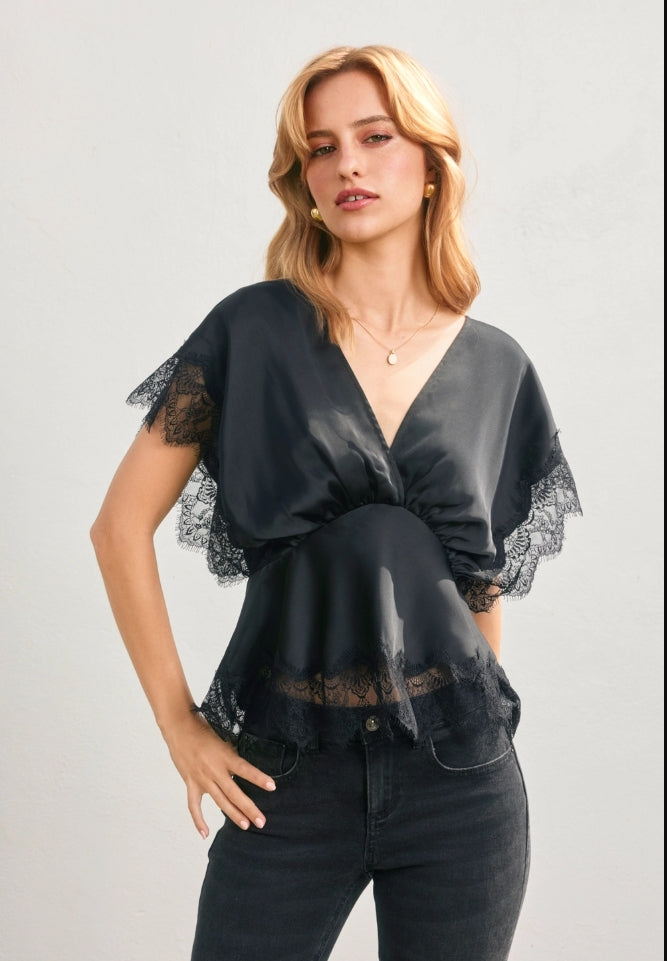Elevate your wardrobe with this sophisticated Black Satin Angel Lace Blouse, designed to make you feel confident and beautiful. The delicate lace detailing pairs perfectly with a flattering deep V-neckline, while the hidden side zipper closure ensures a seamless, polished look. Crafted from luxurious 100% polyester with a fully lined interior, this blouse drapes elegantly without elastic or smocking, allowing the fabric to move naturally with you. Perfect for dressing up or down, this versatile piece celebrates your personal style with understated elegance.