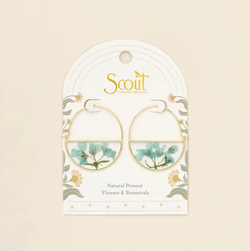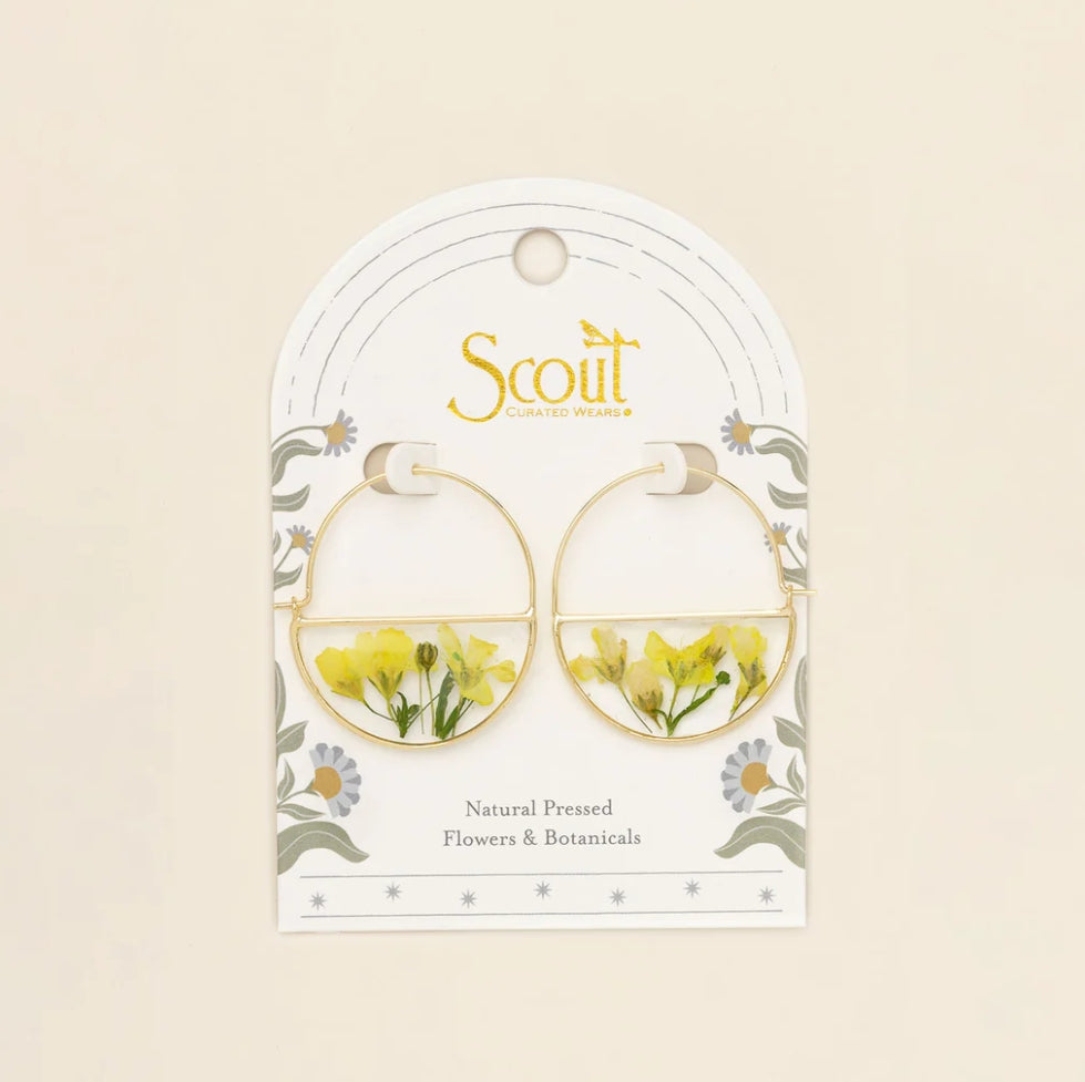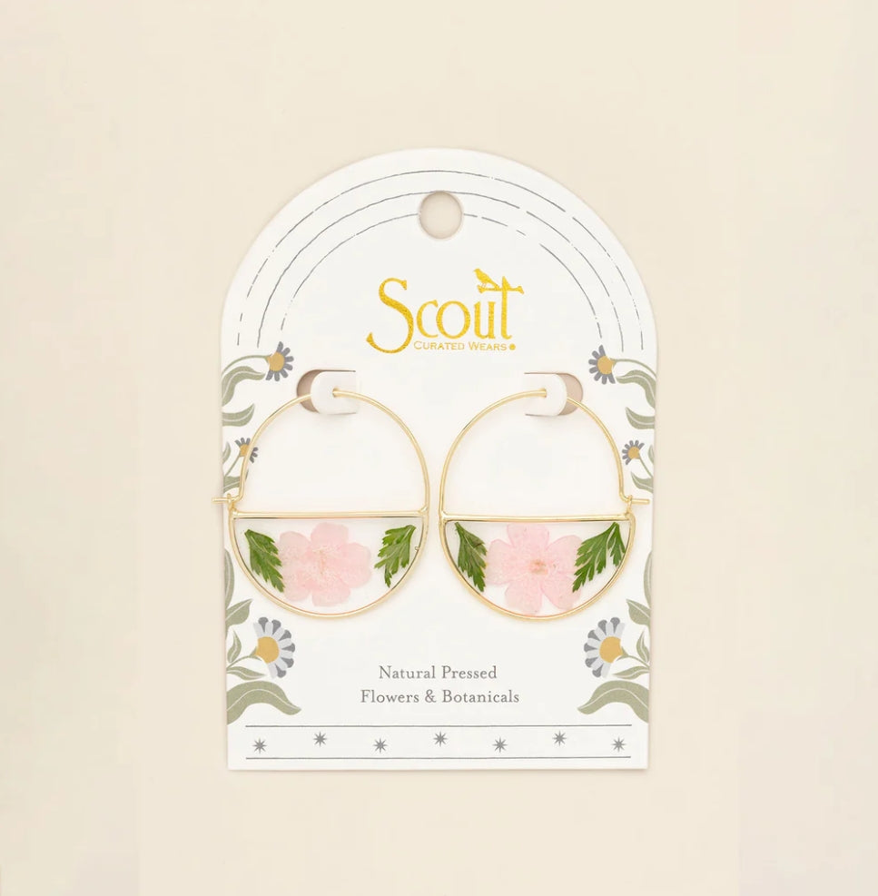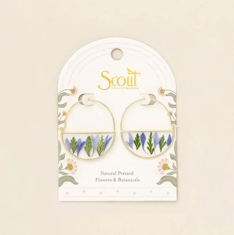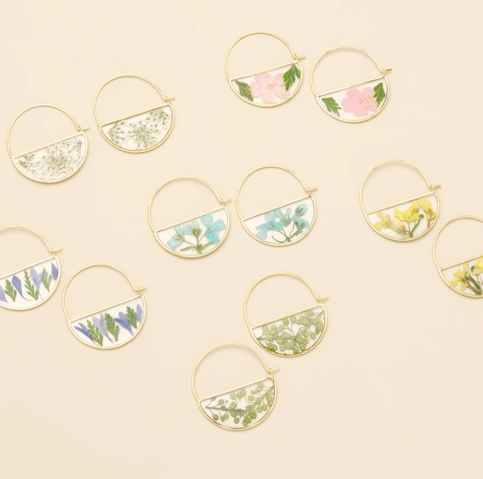 Wild blooms preserved to wear as lasting treasures of beauty; each piece holds a moment in nature to carry with you. Each hoop earring features natural, pressed flowers sealed with 14K gold dipped accents.
