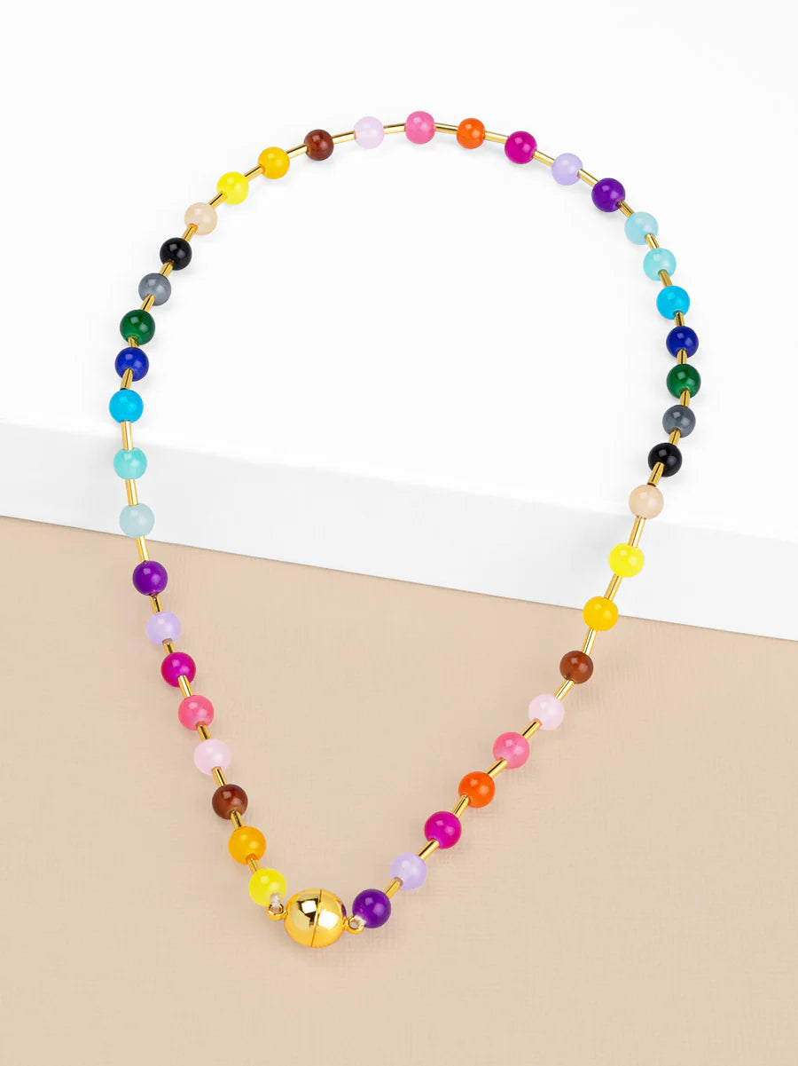 Short necklace composed of glossy glass beads and gold spacers finished with a magnet closure, can be connected to the matching bracelet for added lengths and colors.