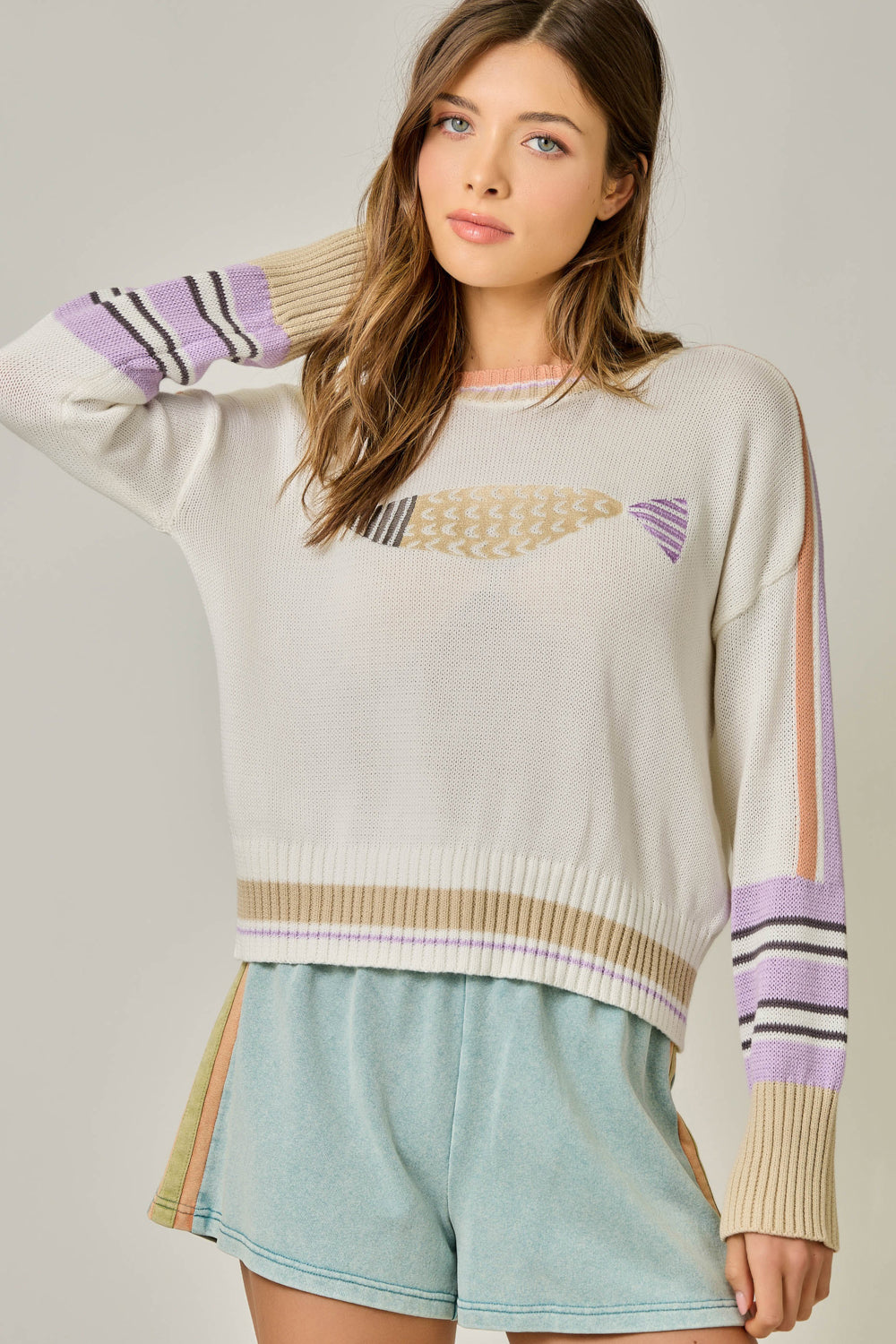 Dive into cozy style with this charming Color Block Pullover Sweater. Featuring a whimsical fish design embroidery that brings a splash of personality to your everyday wardrobe, this pullover combines comfort with character. The soft 100% cotton construction keeps you feeling fresh and breathable, while long sleeves and a classic round neckline offer timeless appeal. Perfect for casual outings or relaxed weekends, this sweater is your go-to piece for laid-back sophistication with a playful twist.