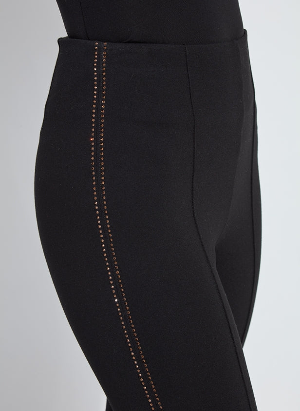 The Elysee Ankle Pant in black offers a sleek, ankle length with a 27.5" inseam, perfect for professional wardrobes. Crafted from comfortable ponte fabric, these pants provide both stretch and structure, ensuring all-day ease and a fun detailed embellishments line the legs for a unique take on dress pants. Ideal for work wear, they combine style and functionality to keep you confident from office to after-hours.